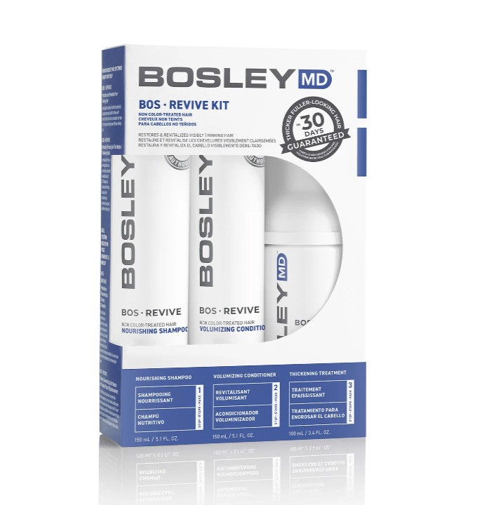 Help restore visibly thinning hair with BosRevive 30-Day Kit designed for Non Color Treated Hair featuring a simple, 3-step system including a Nourishing Shampoo, Volumizing Conditioner and Leave-In Thickening Treatment.