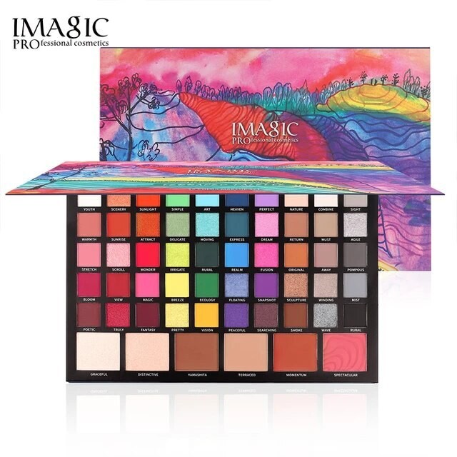 IMAGIC TERRACED 56 COLORS PALETTEALL IN ONE PALETTE :- 50 COLOR EYESHADOW ( MATTE , SHIMER AND GLITTER MIX )2 COLOR HIGHLIGHTER 2 COLOR CONTOUR 2 COLOR BLUSH THE COMPACT PALLET FOR INDIAN SHADES WTH BEAUTYFULL PIGMENTATION .